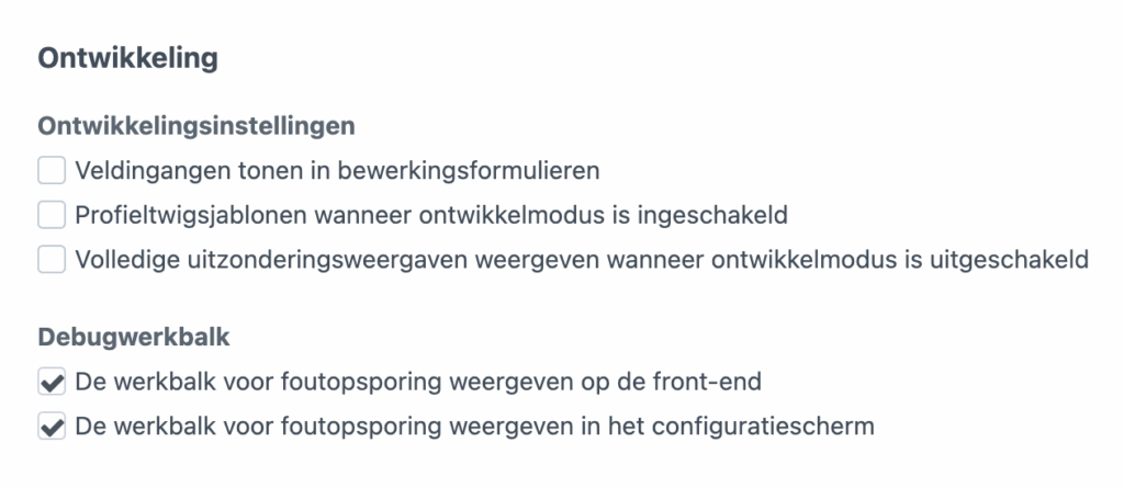 Craft CMS heeft zijn eigen debug bar om laadtijden, geheugen verbruik en database queries te analyseren. Je kunt deze tool ook gebruiken om makkelijk door je applicatie error logs te zoeken. Je kunt de tool activeren via de admin omgeving. Navigeer naar Mijn Account, selecteer het tabblad Eigenschappen en scroll naar beneden tot je de volgende opties tegen komt. Vink deze aan zoals in de afbeelding.