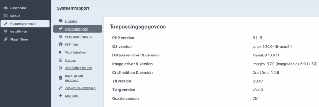 Voordat je kunt beginnen met een probleem analyse moet je weten waar je staat. Welke versies software je gebruikt van Craft CMS, plugins, PHP, etc. Voor deze eerste stap kan je de meeste informatie in het admin paneel vinden onder Hulpprogramma’s