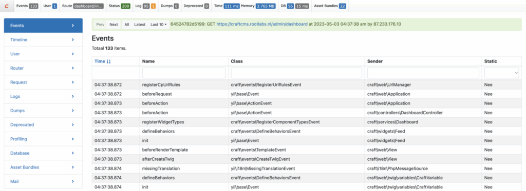 Met de Craft CMS debug bar kan je vervolgens de queries en processen bekijken die plaatsvinden wanneer je een pagina laadt of een actie uitvoert. Wanneer je weet hoe je het probleem kan reproduceren op de website kan deze tool handig zijn om tot een specifieke oorzaak te komen.