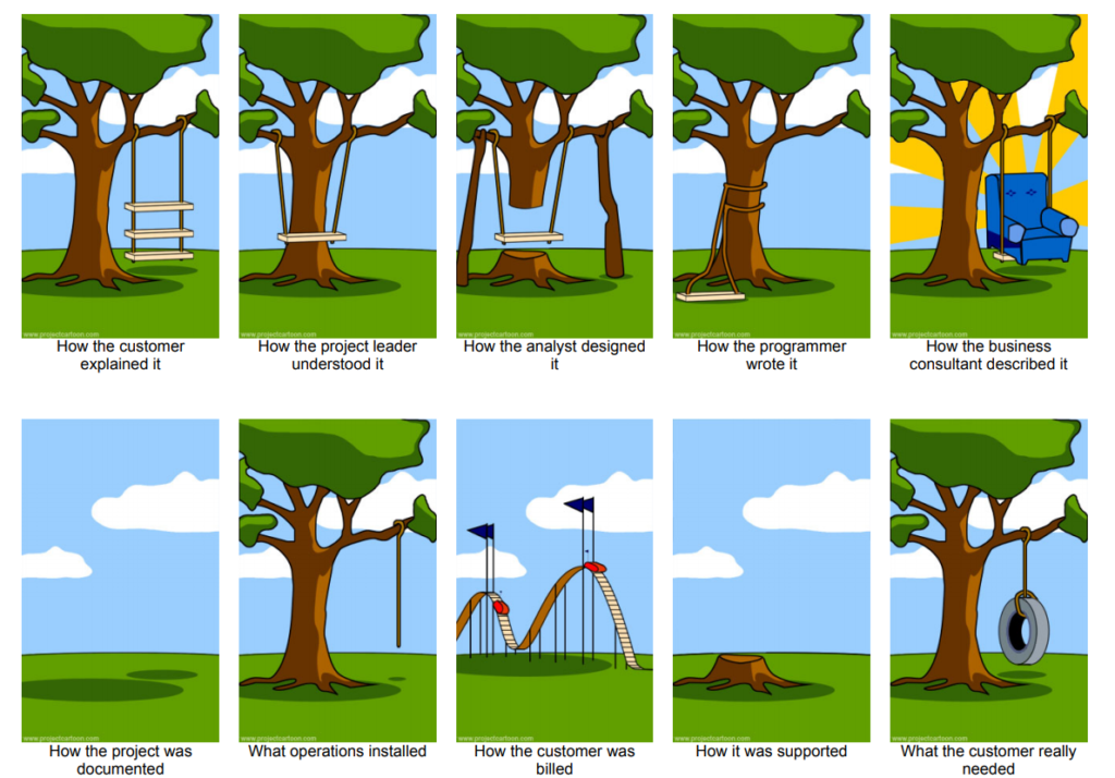De interpretatie van verschillenden afdelingen over hetzelfde project verschilt van elkaar zoals je in de bovenstaande afbeelding kan zien. Het doel van Domain Driven Design is breed gezegd het dichterbij elkaar brengen van development en de andere afdelingen binnen een bedrijf. Communicatie met de klant is daarbij ook een belangrijk onderdeel.